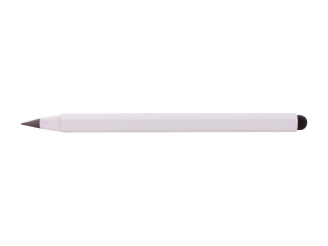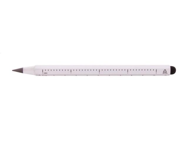Recycled aluminium long-lasting inkless pen with touch stylus and metal alloy tip, which oxidizes the paper. With hexagonal barrel including 11 cm and 4 inch rulers. This pen writes similarly to a pencil, and it is also erasable.
