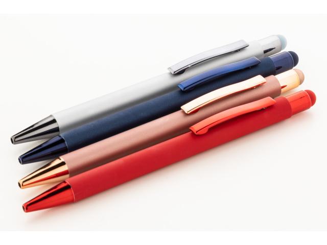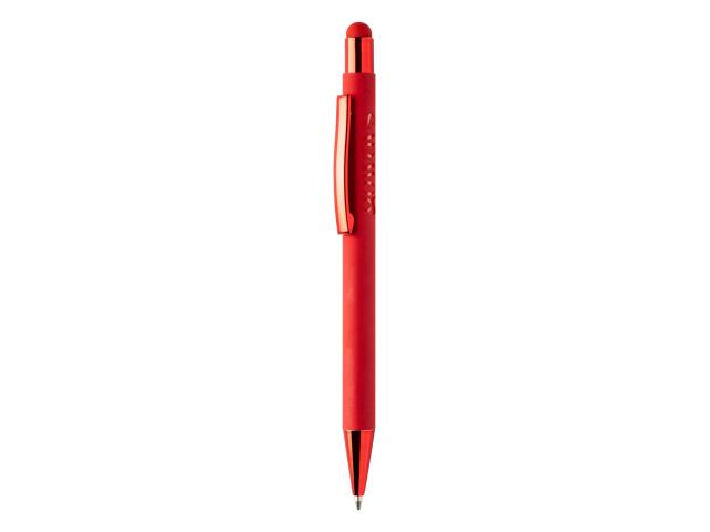 Recycled aluminium ballpoint and touch screen pen with rubberized body and coloured shiny metallic finish parts. With special coating for mirror engraving matching the metallic parts. With blue refill.