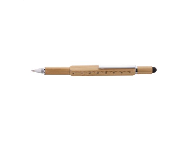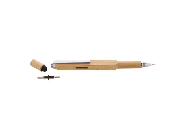 Multifunctional, twist ballpoint and touch pen in bamboo. With double ended screwdriver bit, spirit level and 7 cm ruler. With blue refill.